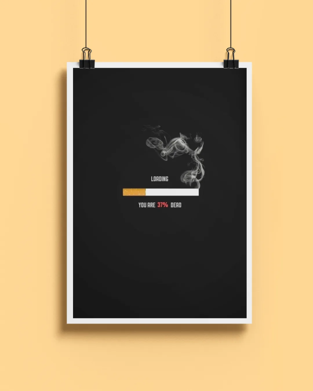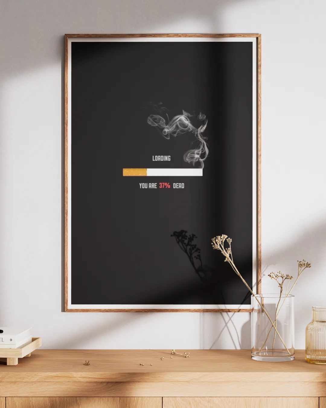 Spark a meaningful conversation with this impactful anti-smoking poster: a “Loading” progress bar made of a burning cigarette, paired with the stark message “You are 37% dead.” Modern graphics and realistic smoke effects drive home the dangers of smoking, making this wall art a powerful choice for health clinics, classrooms, wellness spaces, or as a bold home reminder. Printed on thick 300 GSM luster finish paper, every detail stands out for maximum clarity and a smooth, non-reflective look.