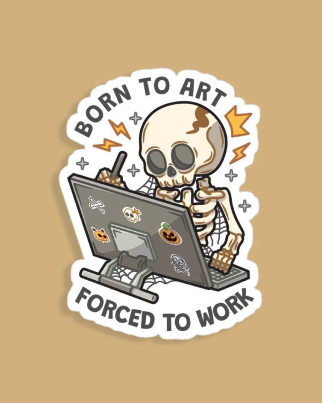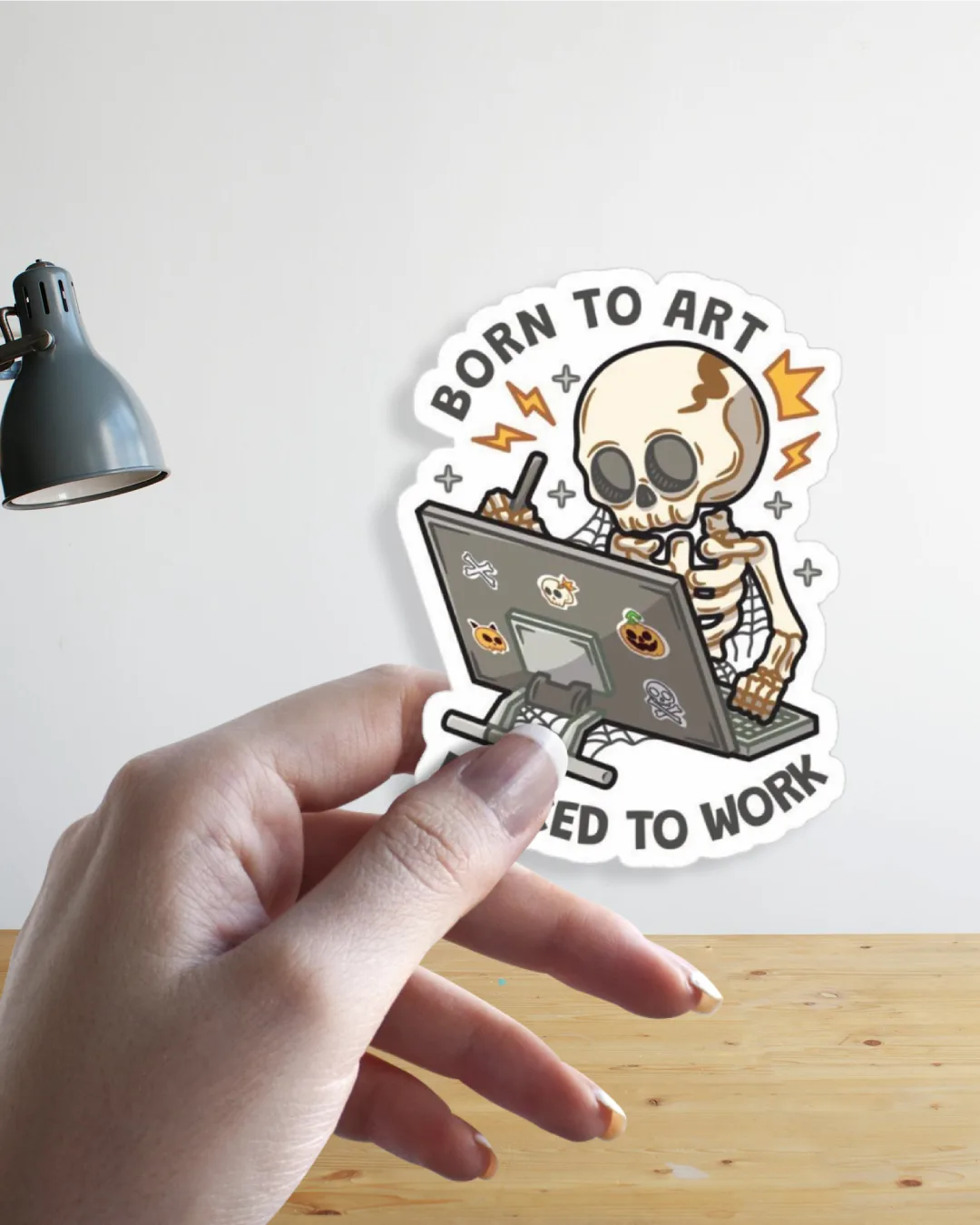 Perfect for creatives with a sense of humor, this “Born to Art, Forced to Work” skeleton sticker is a quirky tribute to every artist’s eternal struggle.