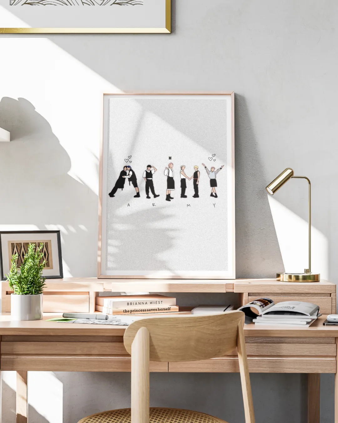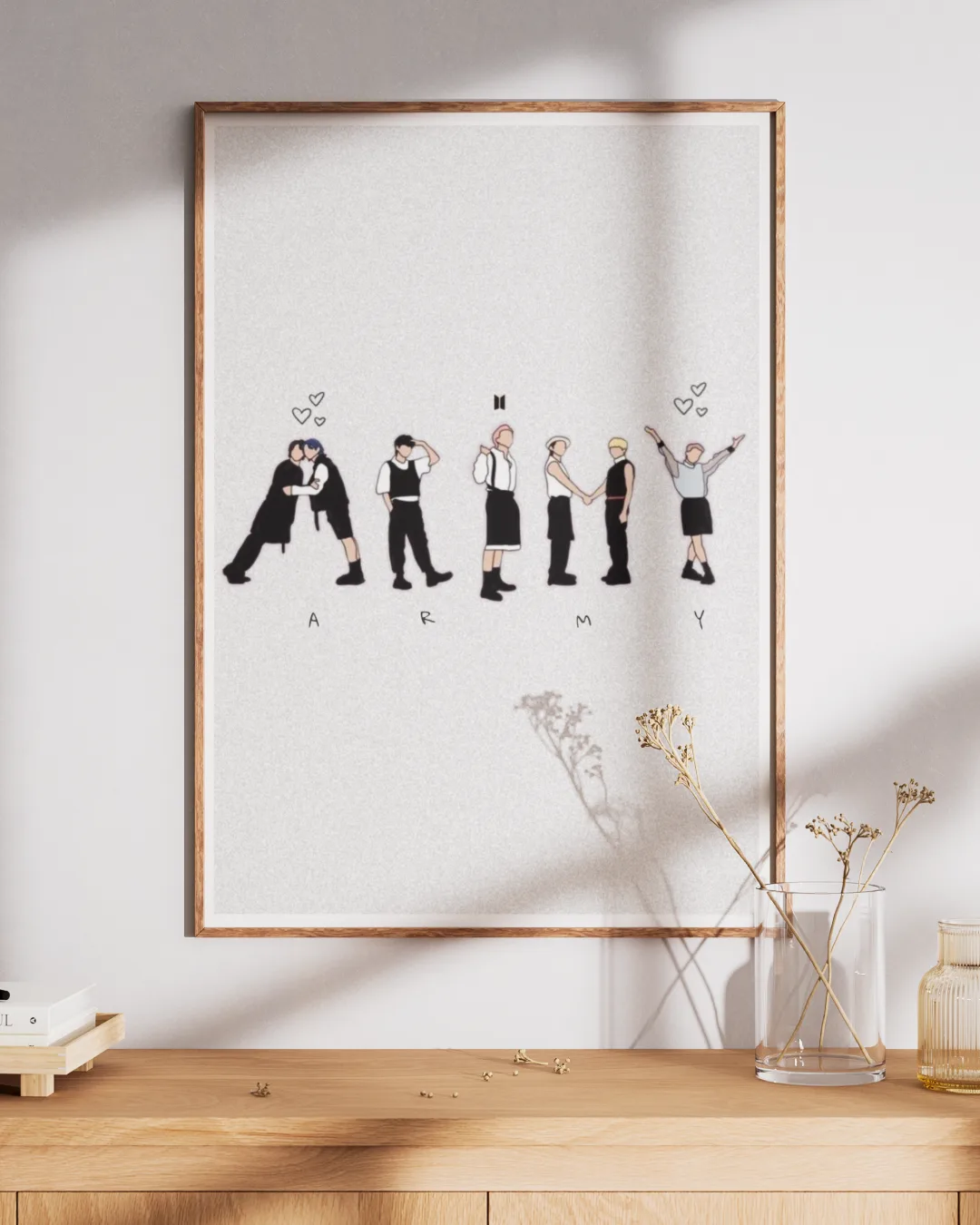 Celebrate the bond between BTS and their fans, ARMY, with this delightful minimalist poster. Featuring simple, adorable line art silhouettes of the seven members forming the word “ARMY” with their poses, this design is both stylish and meaningful. The BTS logo and charming heart doodles make it a subtle yet heartfelt gift for any true fan, perfect for display in bedrooms, workspaces, or living rooms.
