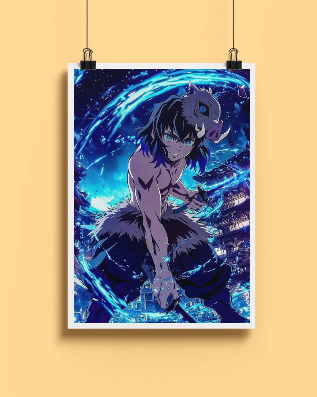 Unleash wild energy with this electrifying Inosuke Hashibira “Beast Breathing” poster! Showcasing Inosuke ready to strike, surrounded by a swirling blue aura and wielding his signature chipped swords, this print captures the character’s untamed spirit and raw action from Demon Slayer. Vivid colors and dynamic composition bring the scene to life—perfect for gaming spaces, collector’s corners, or any anime-inspired room decor.