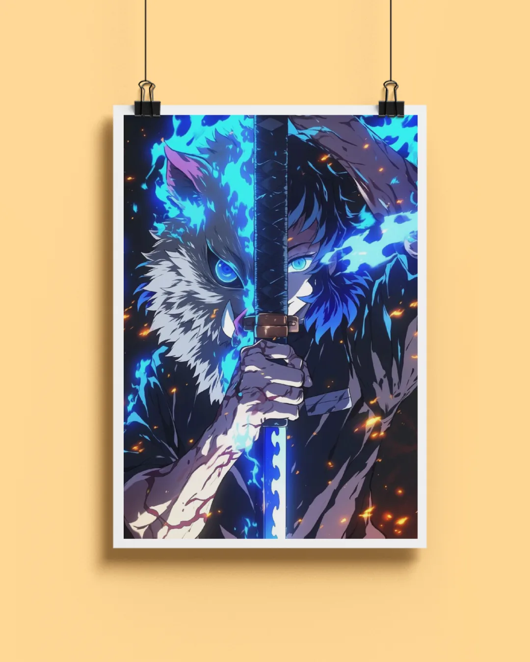 Channel the fierce energy of Demon Slayer with this electrifying “Inosuke Hashibira” poster! Showcasing Inosuke’s signature boar mask and human face, split dramatically by his jagged blade and enveloped in vivid blue flames and embers, this dynamic artwork embodies wild courage and raw power. Printed on thick 300 GSM matte paper, this piece brings a bold anime statement to any collection, gaming room, or creative space.
