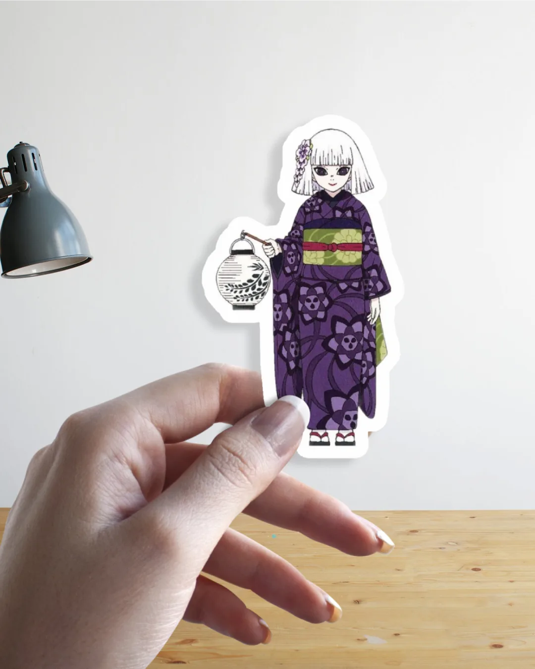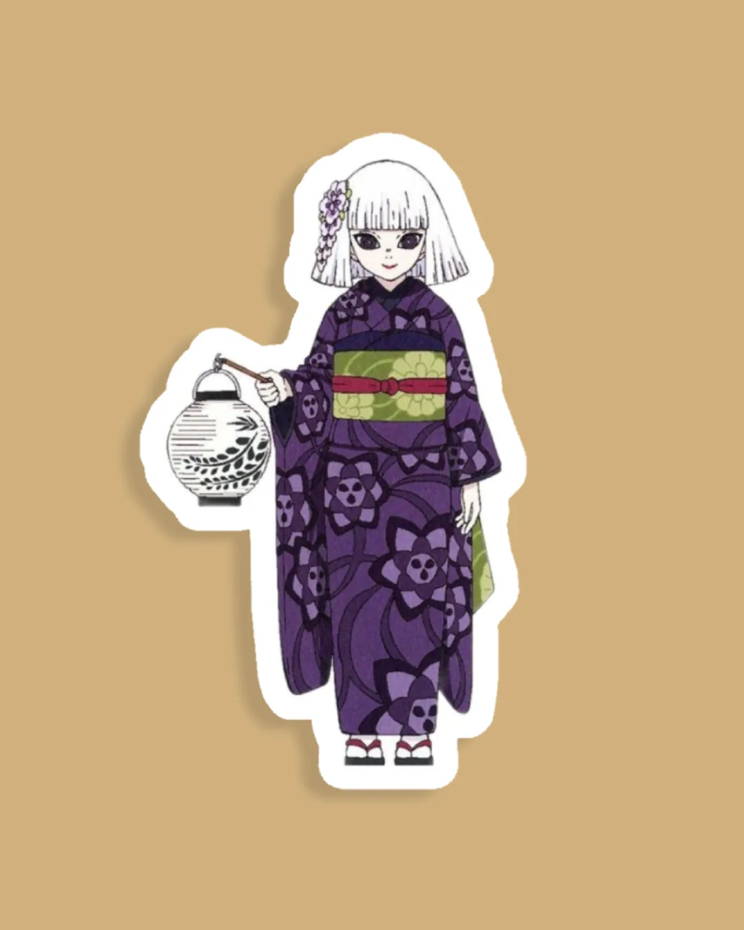 Add elegant festival vibes to your collection with this Lantern Night Kimono Girl sticker! Featuring a pale-haired girl in a deep purple kimono covered with bold floral motifs, a green-and-red obi, and a delicate handheld lantern, this design blends traditional Japanese style with soft, anime-inspired line art.