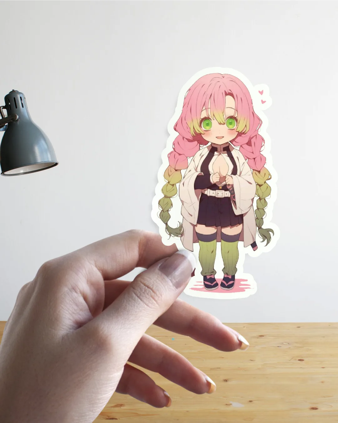 Brighten any surface with this Chibi Love Hashira sticker! Featuring an adorable swordswoman with pastel pink-and-green braids, big sparkling green eyes, and her signature uniform under a white haori, this design captures her sweet, shy expression and bubbly energy in a super-cute style.