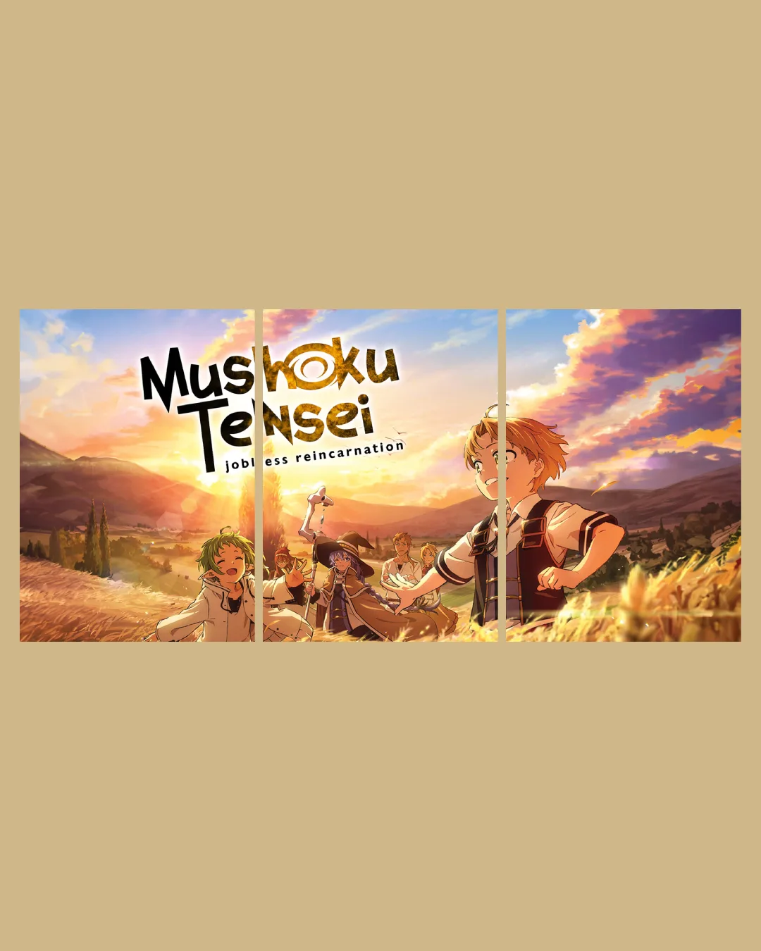 Celebrate new beginnings with anime magic! The “Mushoku Tensei Sunrise” Split Panel Poster features the cast of Jobless Reincarnation in a stunning field under a radiant sky, artfully divided across three panels. Printed on premium 300 GSM matte finish paper, the warm tones and vivid details transform any wall into an inspiring anime scene.