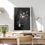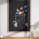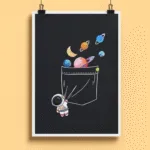 Infuse any space with wonder through this charming poster—a playful astronaut tugging open a giant pocket filled with colorful planets, moons, and rings.