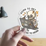 Perfect for creatives with a sense of humor, this “Born to Art, Forced to Work” skeleton sticker is a quirky tribute to every artist’s eternal struggle.
